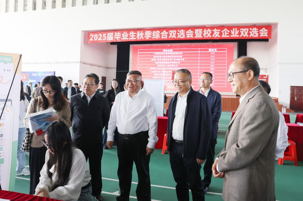 为深入贯彻落实党中央、国务院关于高校毕业生就业工作的决策部署,加强政校企合作,搭建企业人才供需平台,11月10日,我校在雁山校区体育训练馆举办2025届毕业生综合双选会暨校友企业双选会。学校党委书记邓军,党委副书记、校长王敦球,党委副书记吴志强到现场指导,职能部门相关负责人和二级学院负责人、毕业班辅导员到现场与用人单位洽谈,并悉心指导毕业生求职。