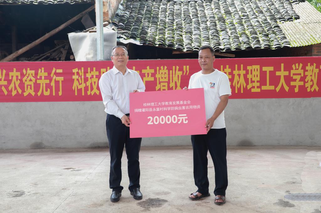 活动仪式上,副校长、学校教育发展基金会名誉理事长王敦球向灌阳县永富村村民代表捐赠了病虫害农用物资折合人民币20000元。