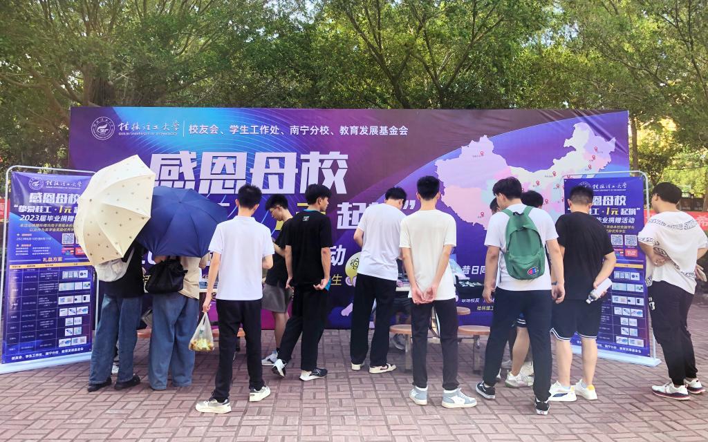 为更好地传递桂工情谊,提升毕业生校友对母校的认同感、归属感,积极营造薪火相传、爱心传递的氛围,6月12日,由校友办、学工部(处)、南宁分校、教育发展基金会联合举办的“感恩母校‘挚爱桂工·1元起捐’”2023届毕业捐赠活动分别在桂林屏风、雁山和南宁空港校区举行。学校党委书记邓军,党委副书记、校长王敦球,党委常委、副校长邓国彬在党办校办、校友办、学工部(处)相关负责人陪同下,到雁山校区现场捐赠点带头捐赠。