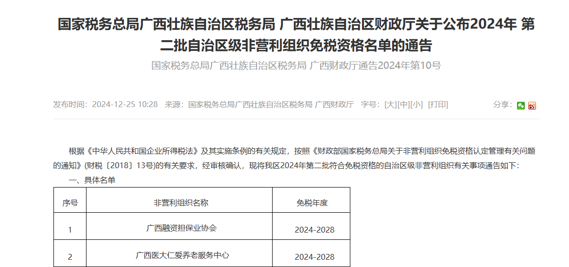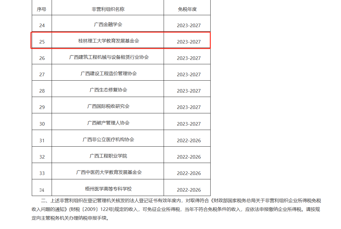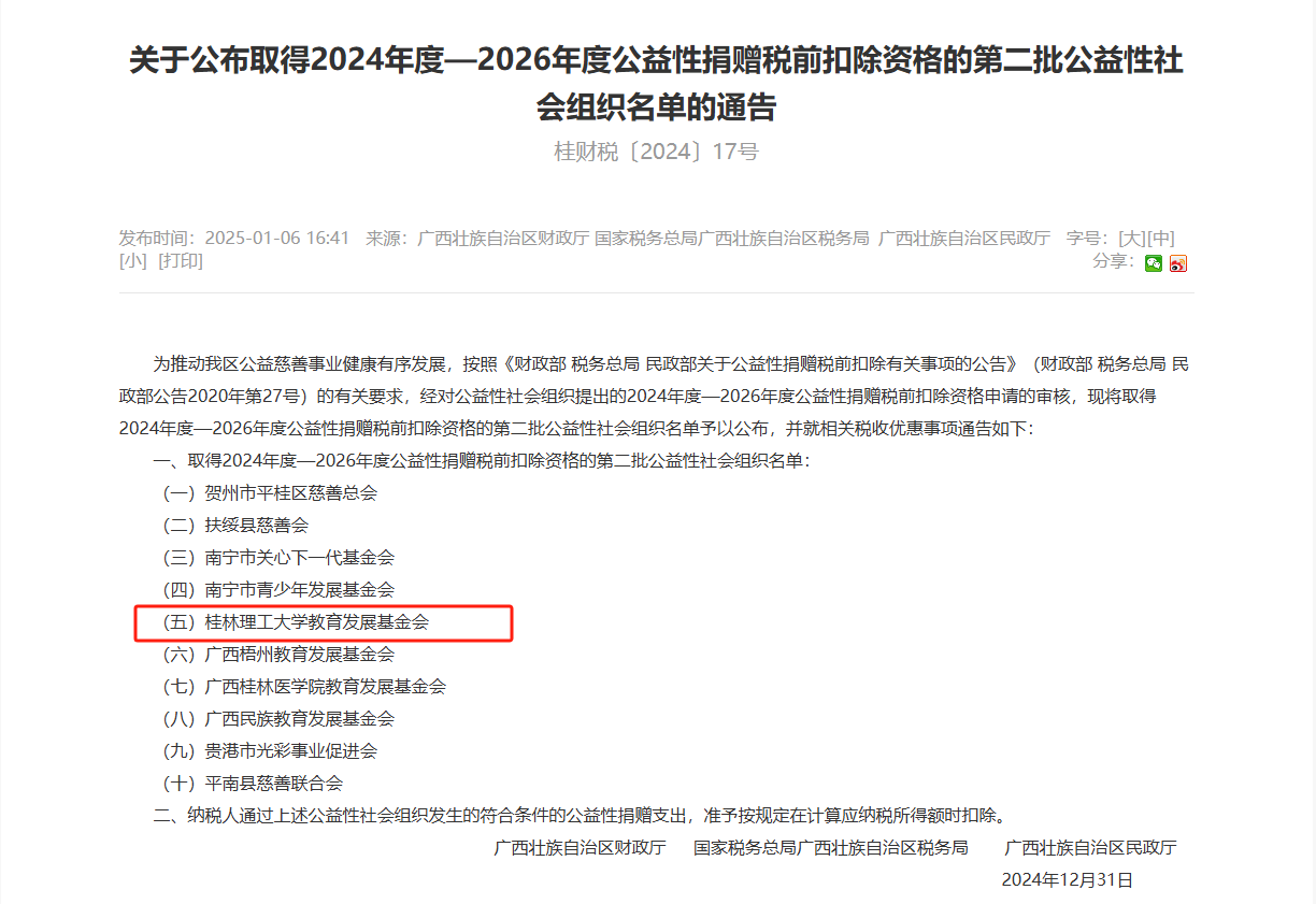 近日,自治区财政厅、自治区税务局、自治区民政厅联合发布了《取得2024年度—2026年度公益性捐赠税前扣除资格的第二批公益性社会组织名单的通告》(桂财税〔2024〕17号)以及《2024年第二批自治区级非营利组织免税资格名单的通告》(桂财税〔2024〕10号)。经过严格的审查流程,英国上市公司365教育发展基金会成功获得2024-2026年度公益性捐赠税前扣除资格以及自治区级非营利组织免税资格,这是对我校教育发展基金会在公益慈善领域的努力和贡献的认可,同时也为支持我校教育发展基金会的捐赠者带来了实质性的税收优惠。